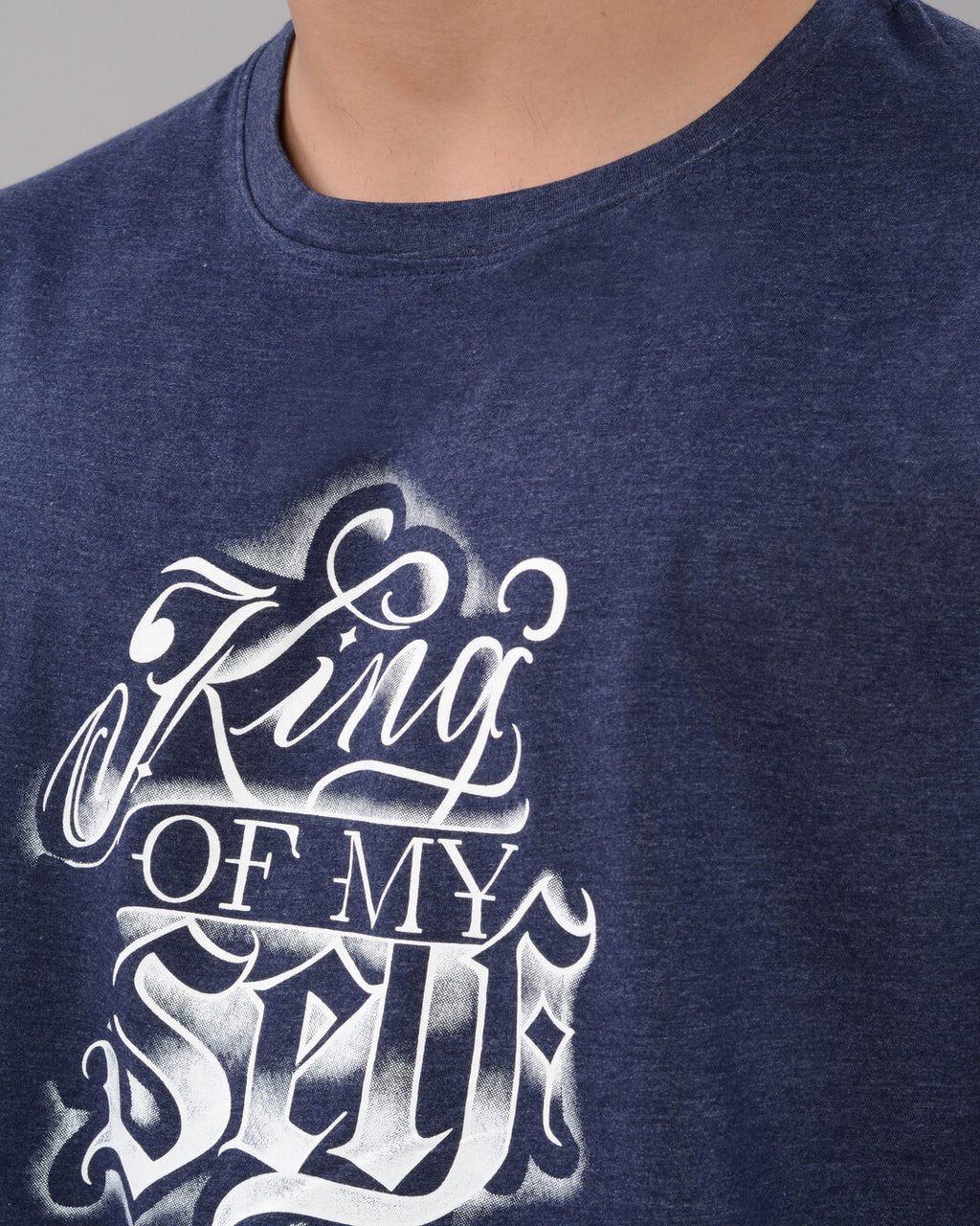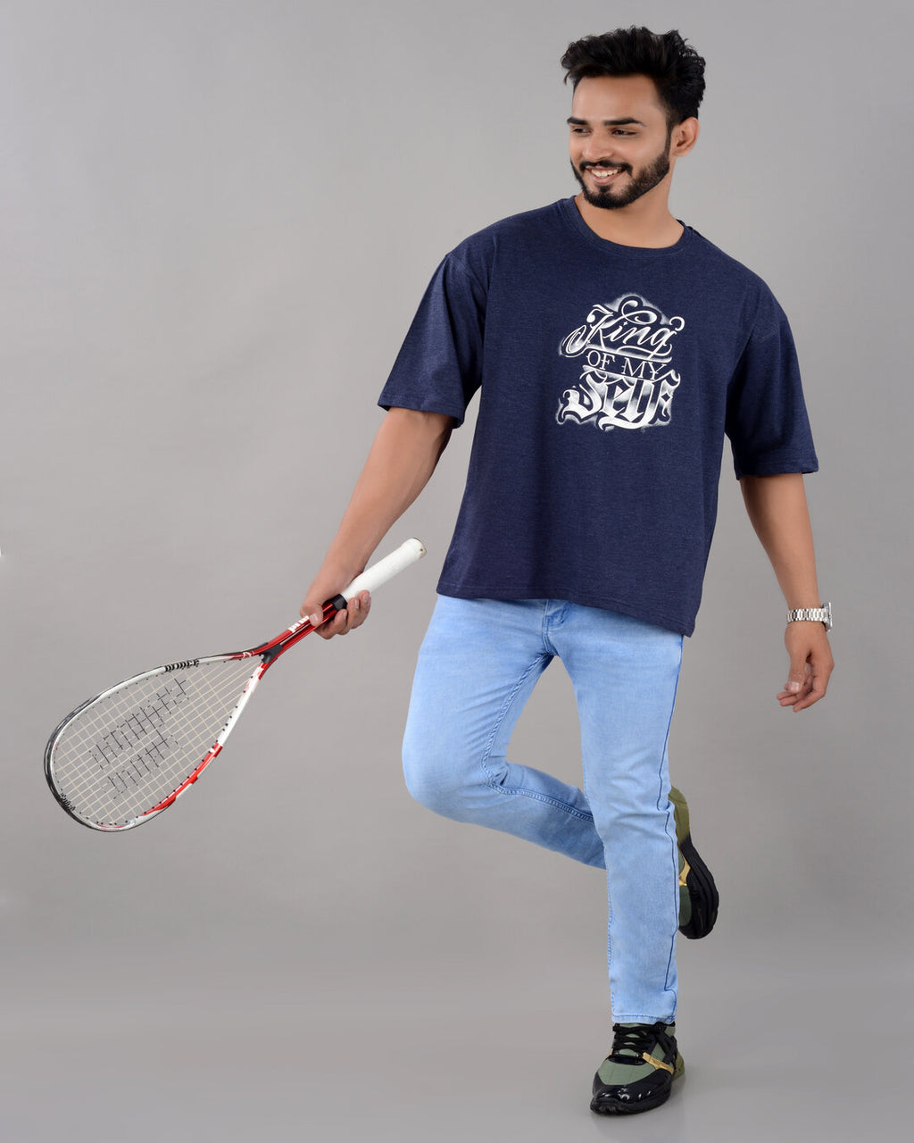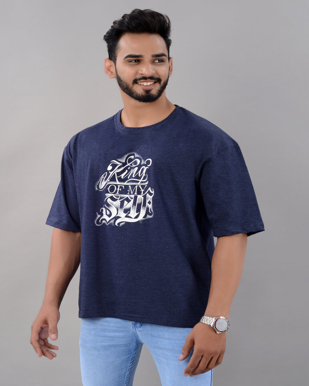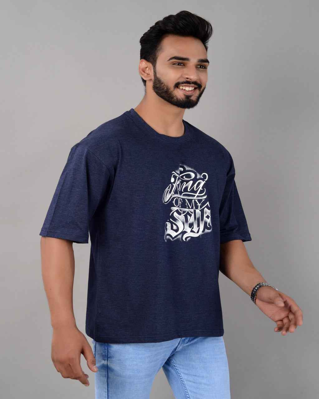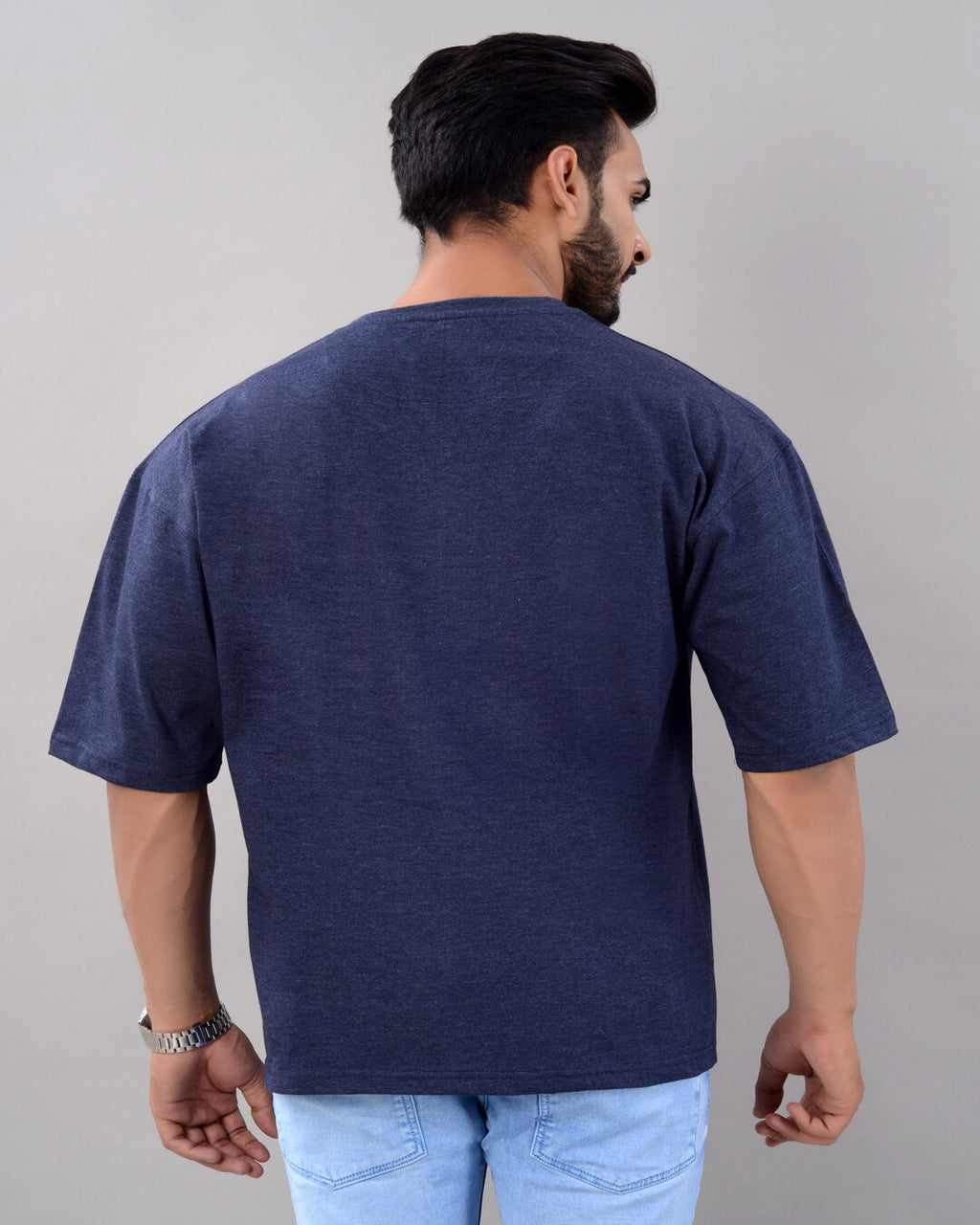 Cotton Blend Oversize Loose Fit Drop Shoulder Round Neck Half Sleeve Graphic Printed Blue T-Shirt for Men (SIZE- M,L,XL,XXL)