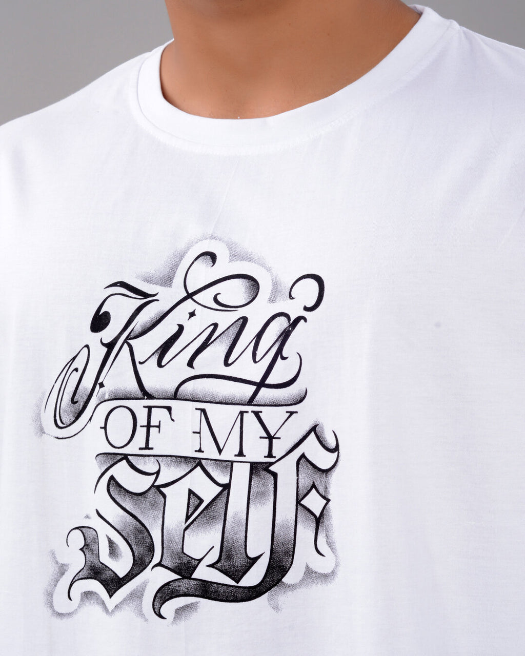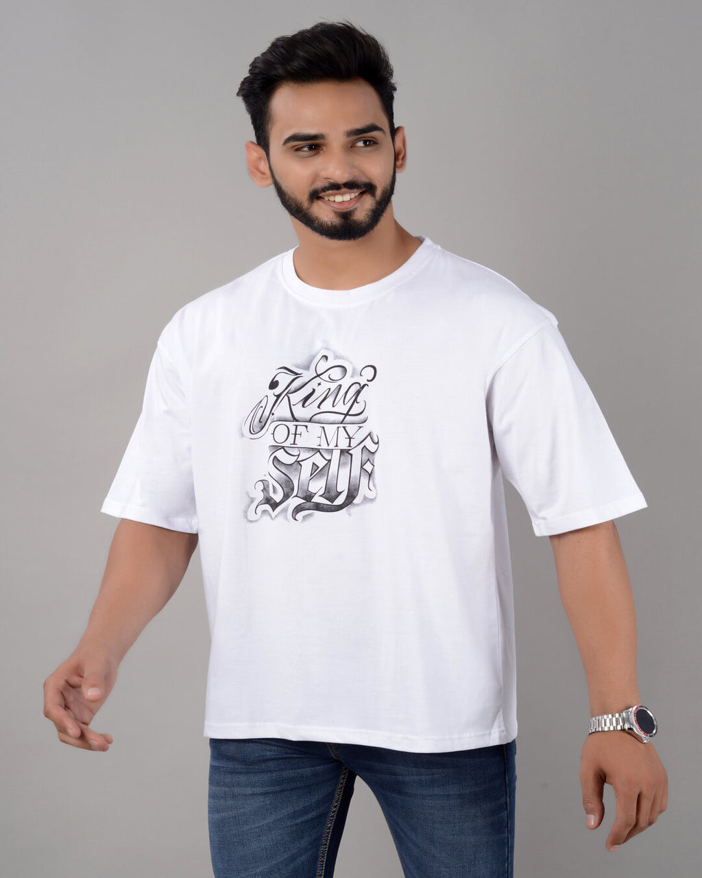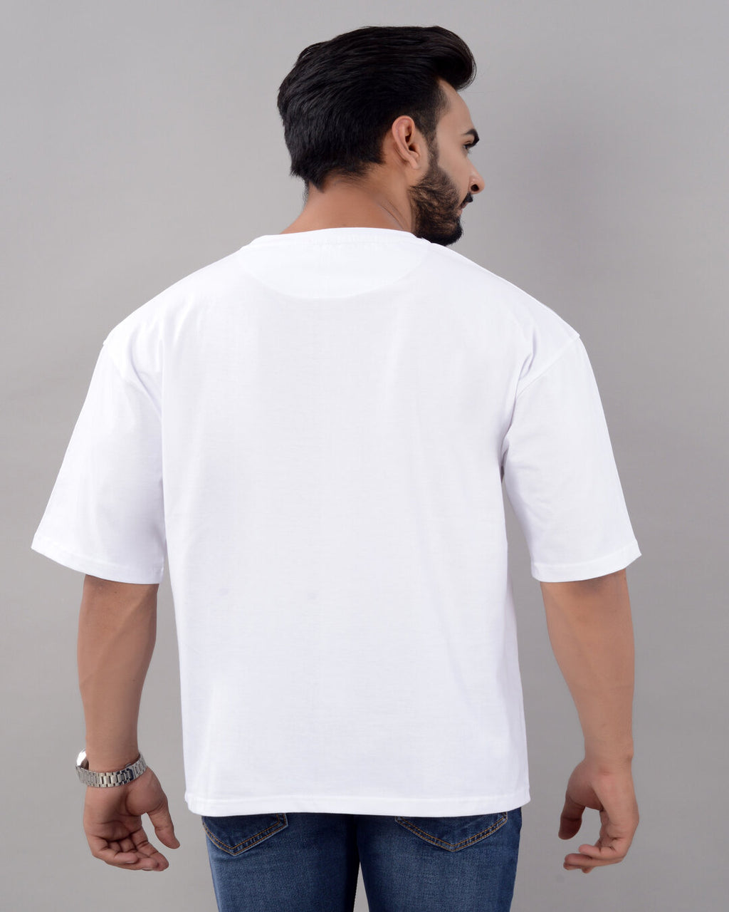 Cotton Blend Oversize Loose Fit Drop Shoulder Round Neck Half Sleeve Graphic Printed White T-Shirt for Men (SIZE- M,L,XL,XXL)